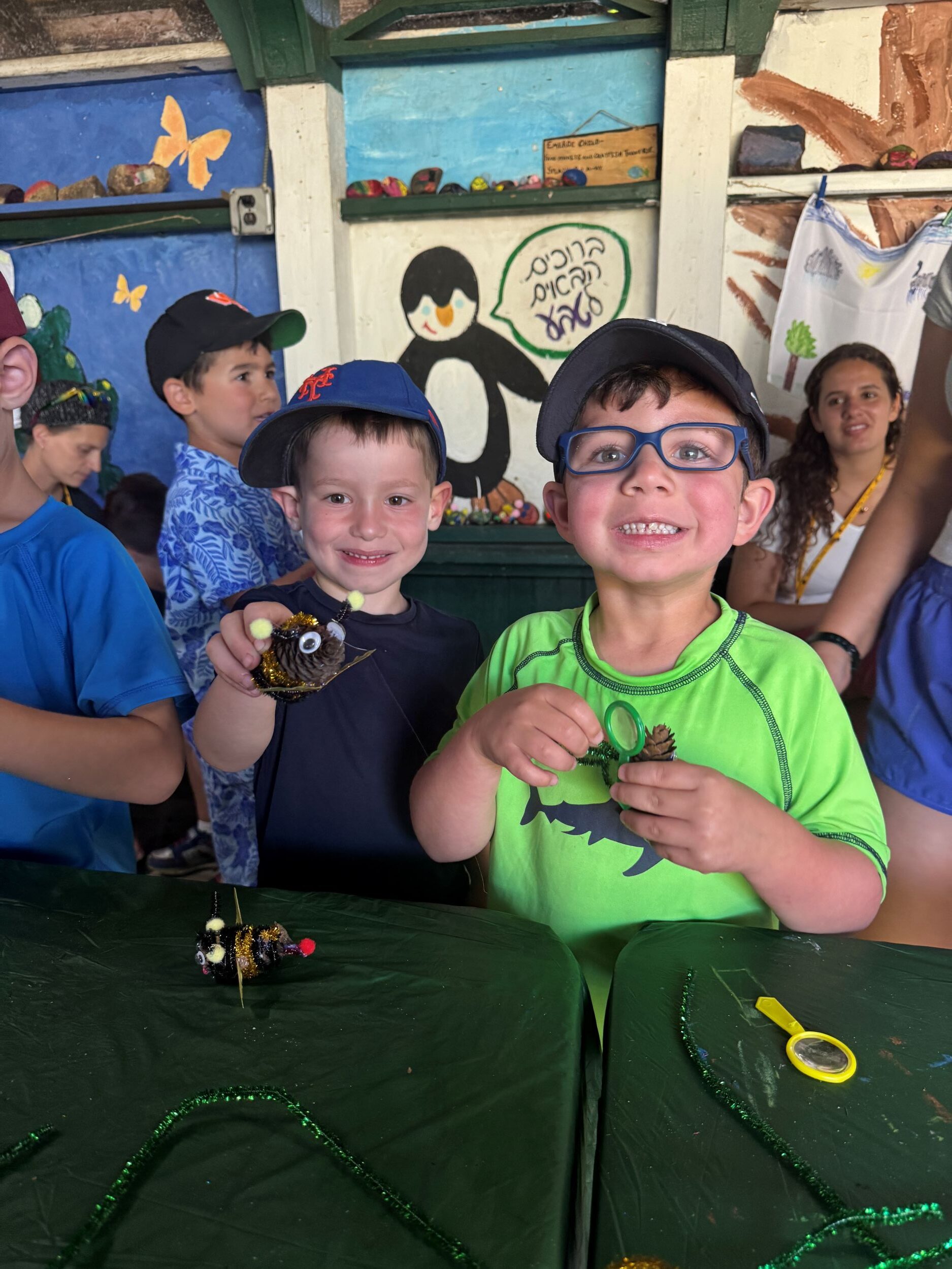 We started the second session this week by welcoming new campers to Kochavim and jumped right into the fun! The highlight of the week was celebrating Yom Yisrael! The day was filled with exciting activities around camp. Kochavim boarded a pretend morning El-Al flight and landed in Israel, where they visited the shuk (market)! They tasted fresh limonada (lemonade) and ordered pretend falafel with very silly toppings! They also made wish bracelets with their hopes for Israel, decorated fun stickers for their water bottles, and mixed their own besamim (spices) packets. With all the colors, sounds, and smells, the Israeli shuk truly came to life at camp! Later, the campers took part in a special Israel-themed peulat edah (activity) led by our amazing Kochavim counselors. They talked about what makes someone a hero and decorated stickers with their own ideas, like “smart,” “brave,” “friendly,” “kind,” “has fast reflexes,” and “someone who helps others.” It was a fun and meaningful activity! In omanut (art), in honor of Yom Yisrael, chanichim decorated wooden hamsas with sequins and paint markers, inspired by the colorful jewelry of Michal Negrin. They even added magnets so their creations could be displayed at home on the fridge!In bishul bachutz (outdoor cooking) chanichim got a taste of Israel by making fresh pita, topped with Israeli chocolate spread for a sweet treat or sprinkled with zaatar (without sesame of course!)for a savory flavor, just like at the shuk! The week was packed with swimming and sports. In softball, Kochavim had a great time practicing making good contact with the ball and trying to hit a home run! In gymnastics, campers worked hard on their somersaults and got better each day! At Teva (nature), the chanichim had so much fun decorating small pinecones with googly eyes and pipe cleaners, turning them into silly, creative creatures! This week in Shiur we got to see a Torah up close. We learned about the Hebrew writing in the Torah and even got to try to write with a feather and ink just like a real Torah is written. In bishul (cooking) this week, Kochavim whipped up “Everything Granola Energy Balls”- a mix of oats, Rice Chex, pretzels, chocolate chips, raisins, a dollop of sunbutter and a drizzle of chocolate syrup – such a delicious treat! In Park Mada, our chanichim became junior detectives as they learned about fingerprints! They discovered that everyone has unique prints, traced their own hands, and used magnifying glasses to look closely at the patterns. Then, just like real detectives, they used cornstarch and brushes to find hidden prints!